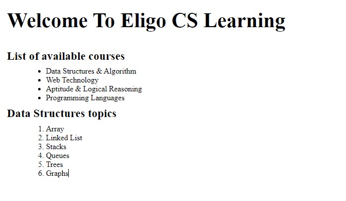 Ordered Lists: The Ordered lists have an order which is either numerical or alphabetical. The <ol> tag is used to create ordered lists in HTML and just like unordered list, we use <li> tag to define or show lists inside <ol> tag.